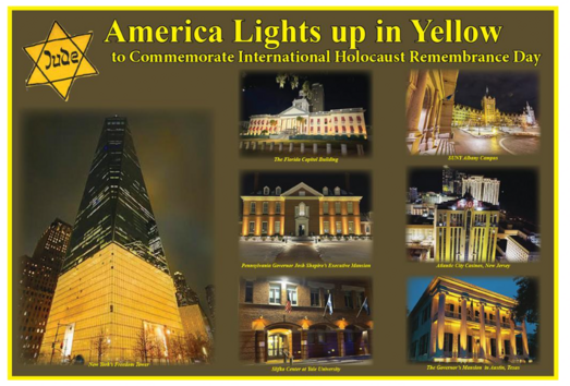 where landmarks and buildings illuminate in yellow to honor the six million Jews and millions of other victims murdered during the Holocaust. The color yellow is a poignant and powerful symbol, referencing the yellow Star of David badge that the Nazis forced Jewish people to wear to identify and persecute them.